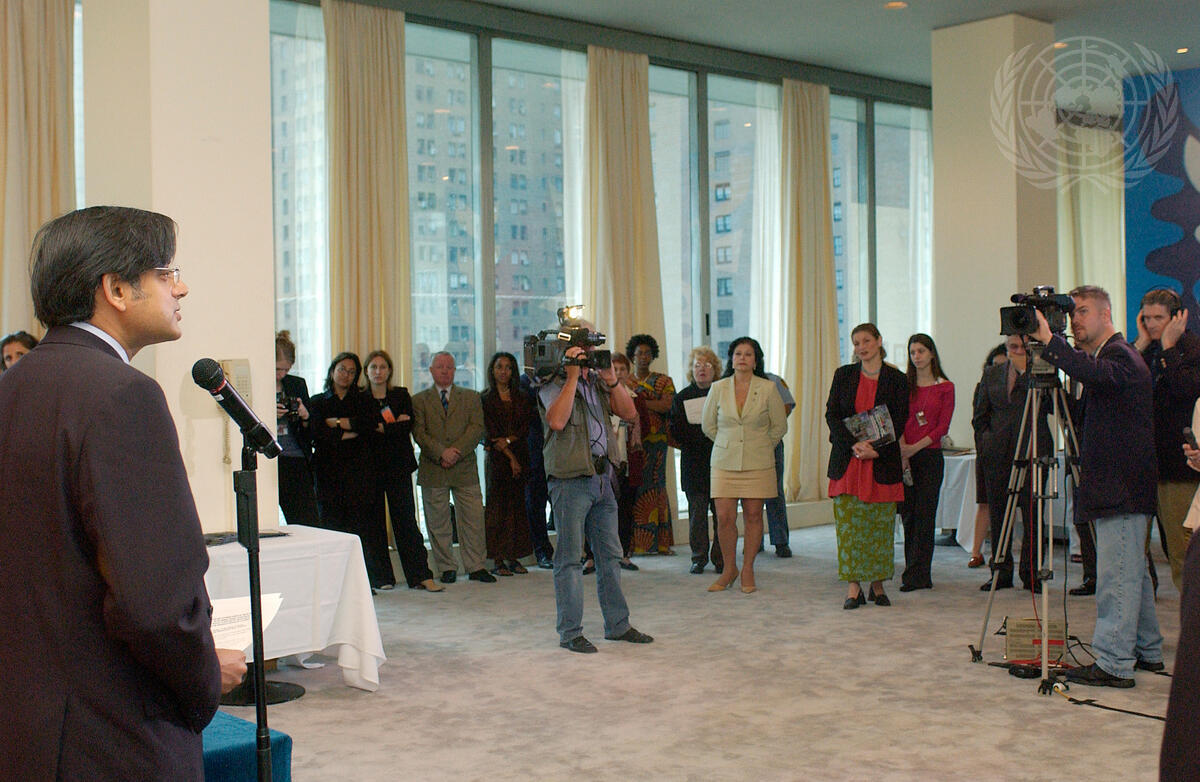 Under-Secretary-General Shashi Tharoor (left) Department of Public Information, addresses a gathering following the signing of an agreement with Gregory Zlotnick, President of the Le Monti Company , concerning the donation of uniforms by Le Monti Company for the United Nations Tour Guides.