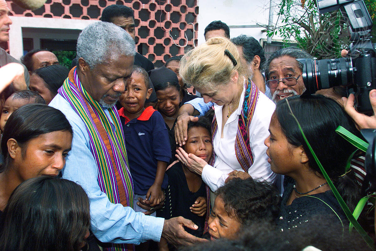 Secretary-General Kofi Annan and Mrs. Nane Annan, comforting some of the children that attended the wreath-laying ceremony in memory of those who had died during last April's massacre at a village church in Liquica, during post-referendum violence.