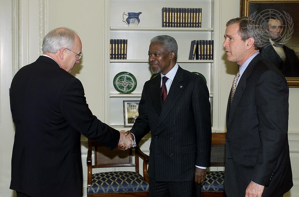 Secretary-General Kofi Annan (centre) shaking hands with United States Vice-President Richard Cheney, as President George W. Bush (right) looks on.