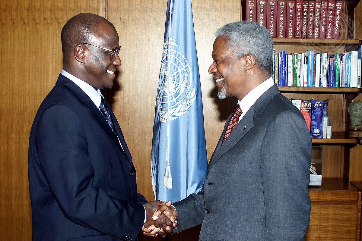Secretary-General Kofi Annan (right) meets with Cheikh Tidiane Sy of Senegal, his Special Representative and Head of the United Nations Peace-building Office in the Central Africa Republic (BONUCA).