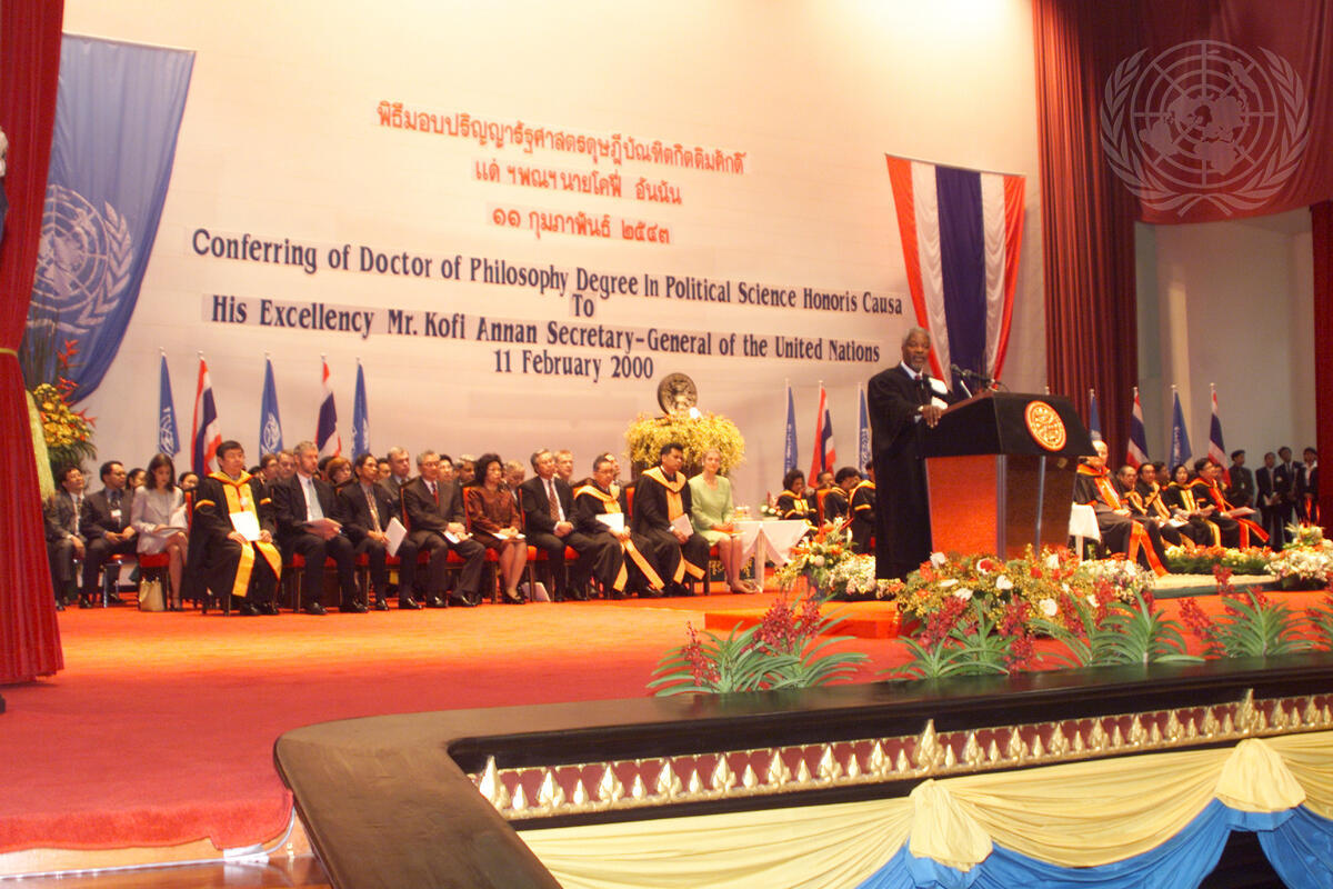 Secretary-General Kofi Annan (at podium) received the Degree of Doctor of Philosophy in Political Science honoris causa from Thammasat University in Bangkok. The Secretary-General addressing the audience at the ceremony.