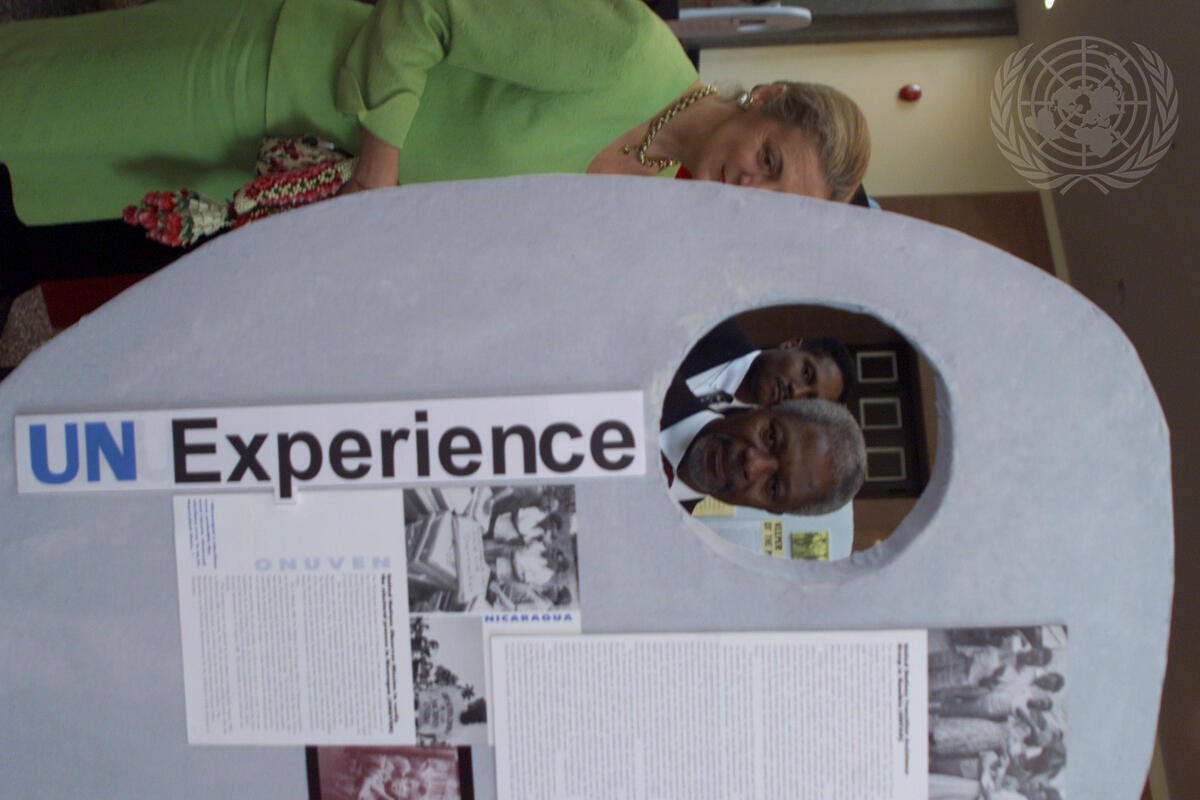 Secretary-General Kofi Annan (right ) and Nane Annan view an exhibit on the life of the Secretary-General, produced by students at Thammasat University.