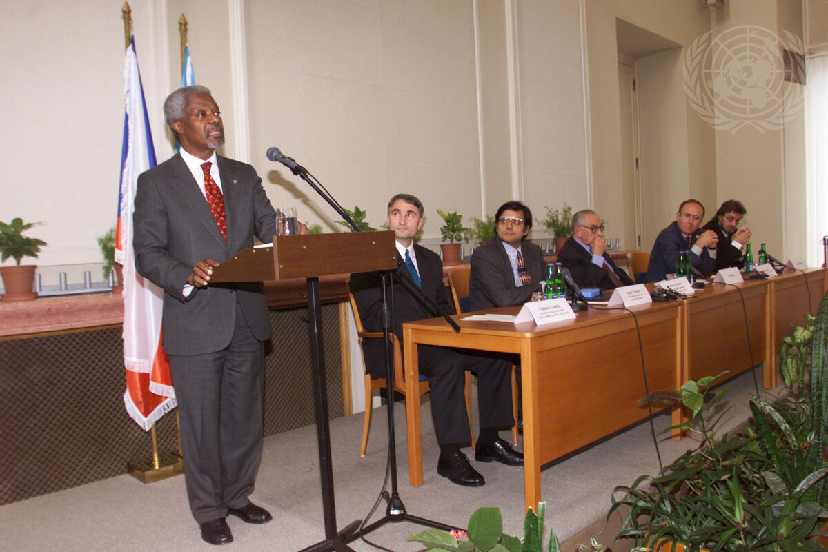Seated (left to right) are: Vladimir Galuska, Permanent Secretary-General Kofi Annan (at podium) makes speech after being awarded the Jan Masaryk Commemorative Medal at the Czech Foreign Ministry. Representative of Czech Republic to the UN; Shashi Tharoor, Director of Communications in the Executive Office of the SG; Otto Pick, First Deputy at the Foreign Ministry; Pino Arlacchi, Executive Director of the UN Office for Drug Control and Crime Prevention; and Alexander Slaby, Director of the UN Department at the Foreign Ministry.
