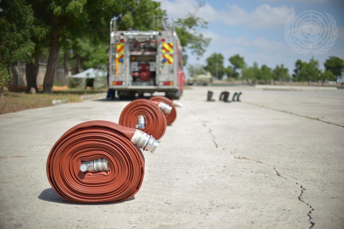 A view of fire hoses and one of the three fire engines donated by NGOs from the United Kingdom.