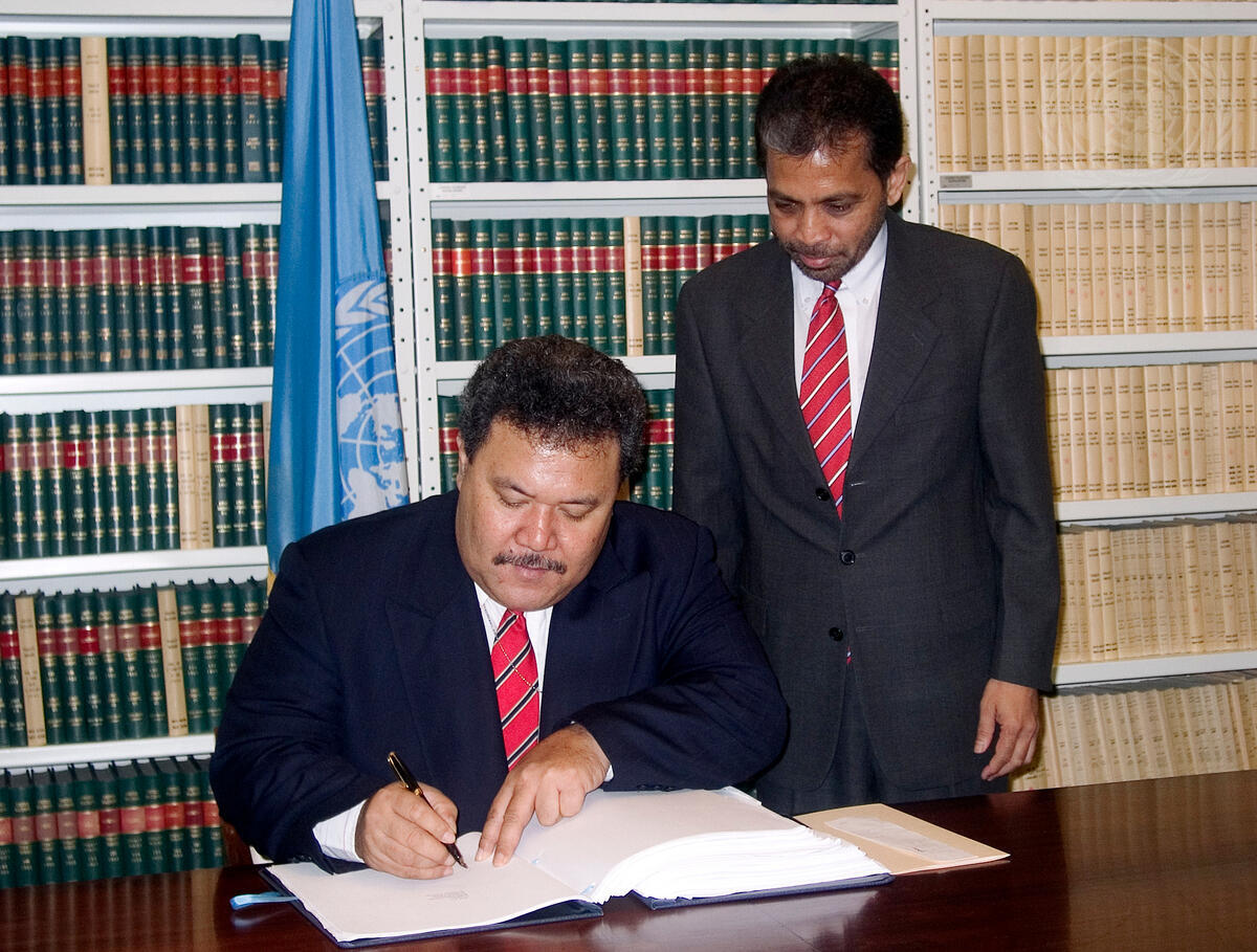 Ambassador Enele S. Sopoaga, Permanent Representative of Tuvalu, signs the World Health Organization Framework Convention on Tobacco Control.