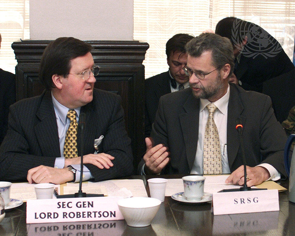 Secretary General Lord Robertson of NATO and Hans Haekkerup (right), Special Representantaive of the Secretary-General in Kosovo, meeting in Pristina.