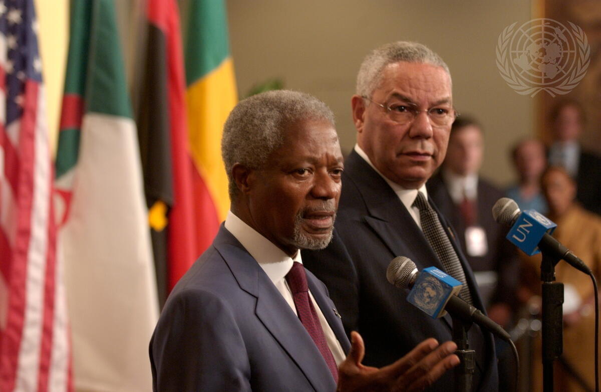 The Secretary-General and H.E. Mr. Colin Powell, United States Secretary-of-State speaking at stakeout about Darfur
