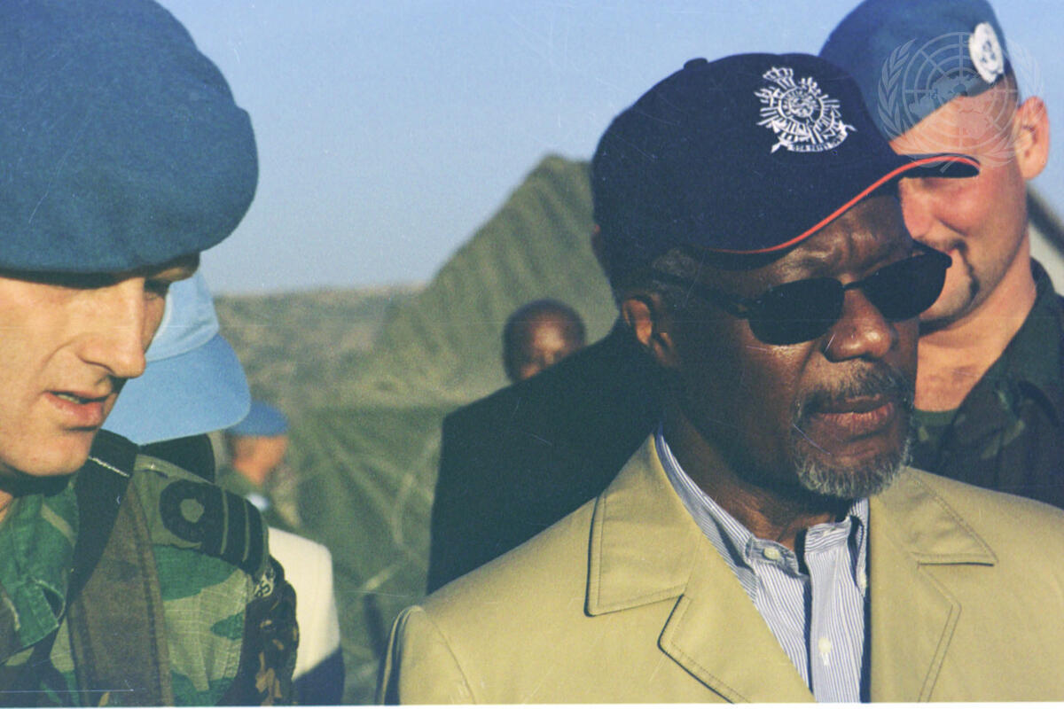 Secretary-General Kofi Annan walks through Adi Keyh, a village 100 kilometers south of Asmara, which serves as a military observer station. Addressing the thousands who came out to welcome him, Mr. Annan said he was very ""touched by this warm generous reception and the incredible desire for peace."" He said the United Nations would be working with them through the peace process. ""As you began to pick up your pieces and rebuild your lives, you must know you are not alone,"" he told them.