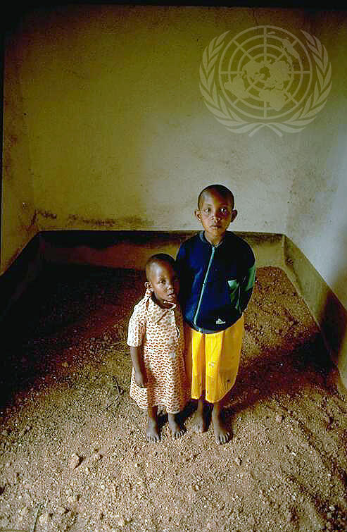 Two AIDS orphans on the grave of their parents inside their house near Gikongoro, Rwanda. Since the death of their parents, the children have had to take care of themselves.
