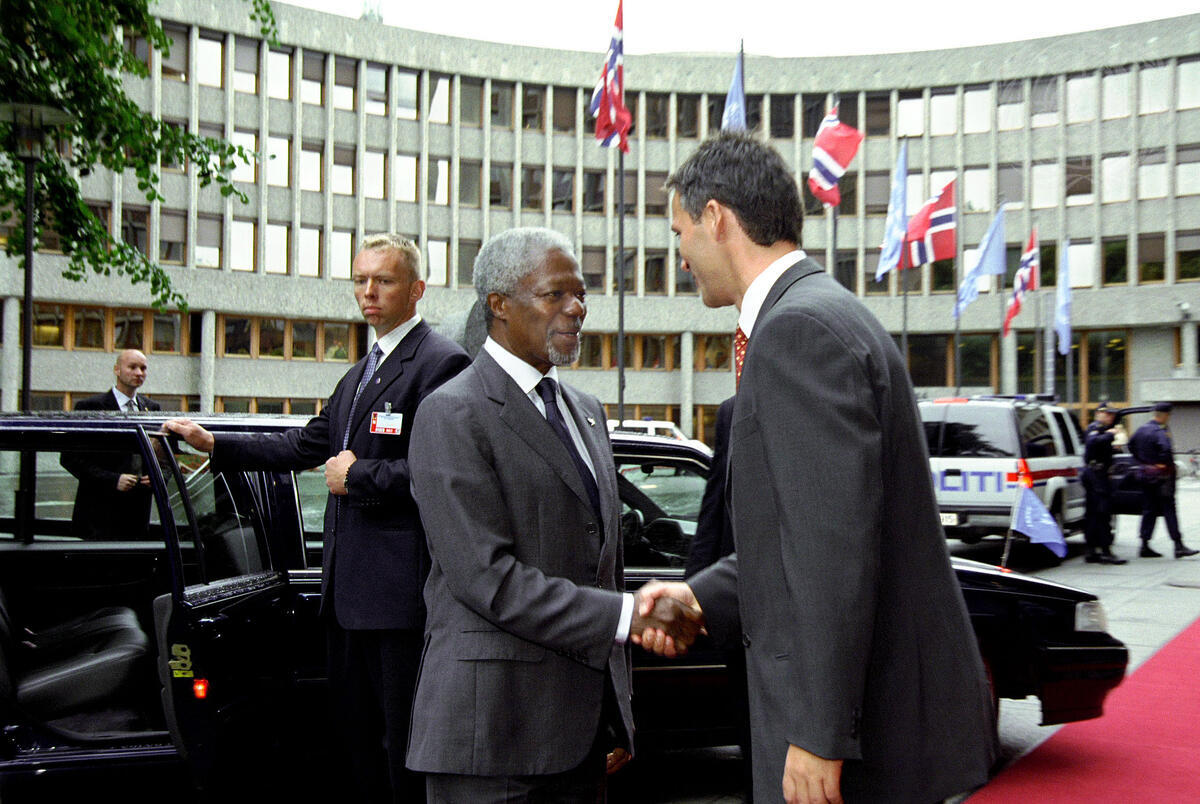 Secretary-General Kofi Annan (left) being greeted by Jens Stoltenberg, Prime Minister of Norway.