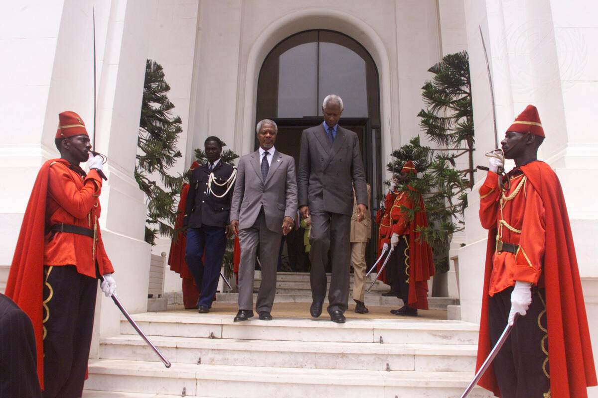 Secretary-General Kofi Annan (centre, left) and President Abdou Diouf of Senegal (centre, right) departing Palais de la République in Dakar.