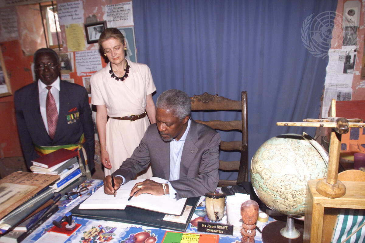 Secretary-General Kofi Annan signs the livre d'or at the end of his tour of the island of Goree, once a major slave port. Looking on are Mrs. Nane Annan and Ubraim Alexander Diagne, the Mayor of Goree.