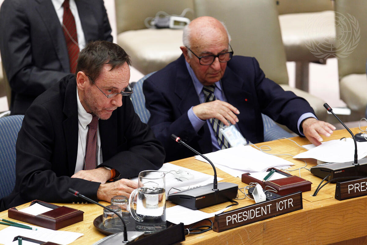Vagn Joensen (left), President of the International Criminal Tribunal for Rwanda (ICTR), briefs the Security Council on the work of the ICTR. Beside him is Theodor Meron, President of the International Criminal Tribunal for the Former Yugoslavia (ICTY) and President of the International Residual Mechanism for Criminal Tribunals.
