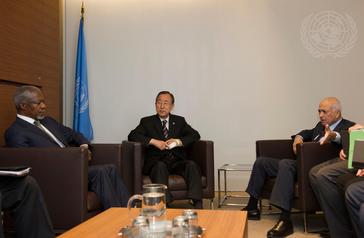 Secretary-General Ban Ki-moon (centre) meets with Nabil el-Araby (right), Secretary General of the League of Arab States, and Kofi Annan, UN-Arab League Joint Special Envoy on Syria, before their joint briefing to the General Assembly on Syria.
