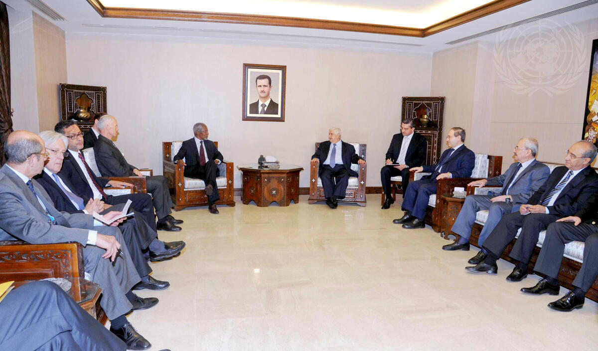 Kofi Annan (centre left), Joint Special Envoy of the United Nations and the League of Arab States for Syria, meets with Walid Al-Moualem (centre right), Minister for Foreign Affairs of the Syrian Arab Republic, in Damascus.