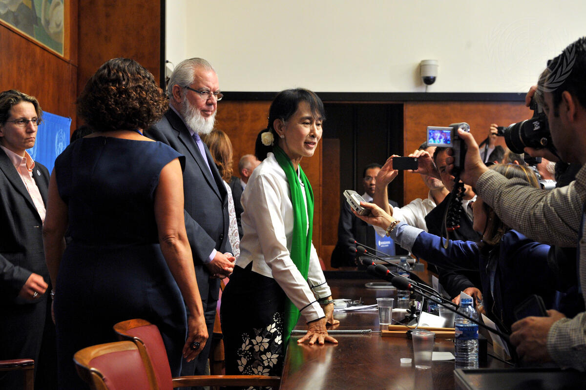 Aung San Suu Kyi (front), General Secretary of Myanmar’s National League for Democracy, speaks to reporters following her address to the International Labour Conference in Geneva, Switzerland. Pictured behind her is Juan Somavia, Director-General of the International Labour Organization (ILO).