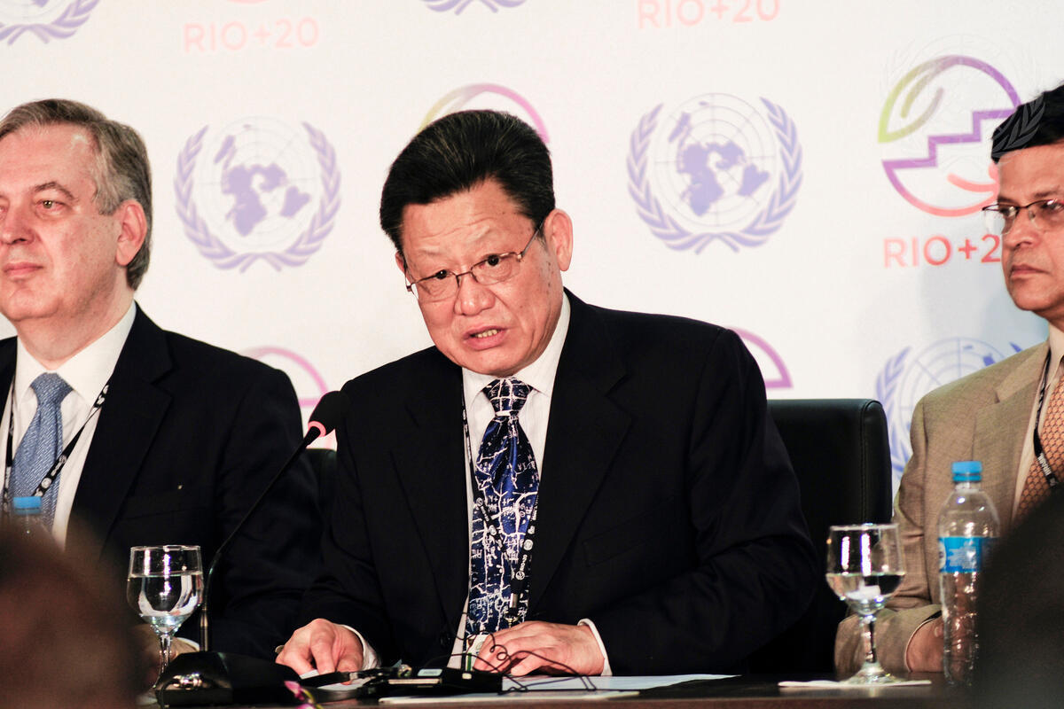Sha Zukang (centre), Secretary-General of the Rio+20 UN Conference on Sustainable Development, updates the press on the summit's objectives and the status of negotiations one week before the Conference is set to open in Rio de Janeiro, Brazil.