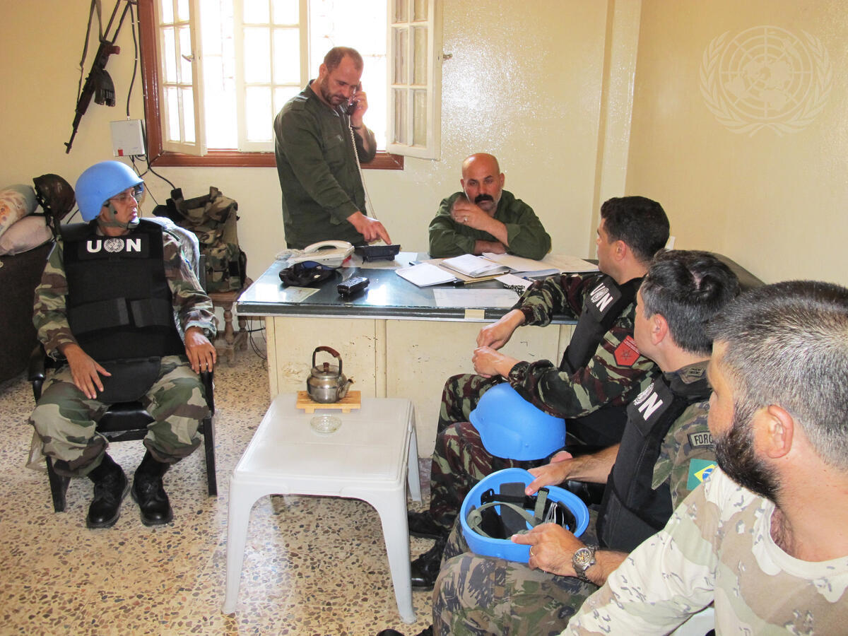 UN inspectors and monitors with the UNSMIS observer mission are shown during a meeting following renewed shelling this weekend in the city of Homs, Syria.
