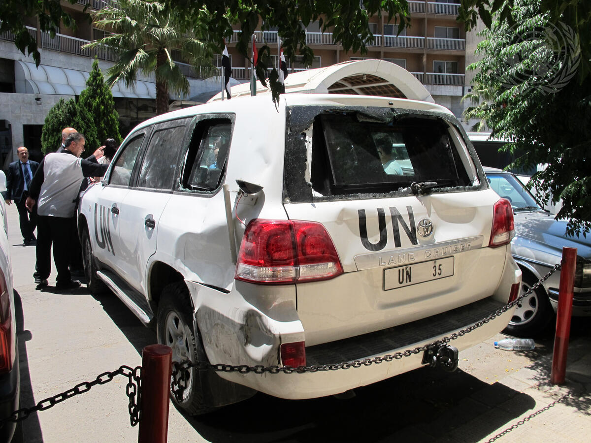 Using stones and metal rods, angry crowds in El-Haffeh, Syria, damaged UN vehicles yesterday and fired on the convoy as officers of the UNSMIS observer mission tried to access the area.