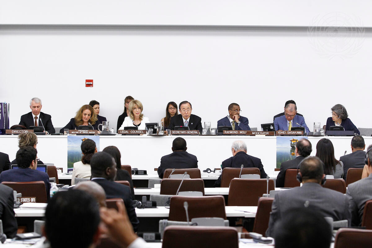 Secretary-General Ban Ki-moon speaks at today's commemoration of the thirtieth anniversary of the UN Convention on the Law of the Sea (UNCLOS), which was adopted on 10 December 1982 and entered into force on 16 November 1994. The commemoration is being held to coincide with this year's World Oceans Day. Also on the panel today are, from left, Serguei Tarassenko, Director of the Division for Ocean Affairs and the Law of the Sea in the Office of Legal Affairs; Isabelle F. Picco, Permanent Representative of the Principality of Monaco to the UN; Patricia O'Brien, Under-Secretary-General for Legal Affairs; Raymond O. Wolfe, Permanent Representative of Jamaica to the UN; and Yohei Sasakawa, Chairman of the Nippon Foundation.