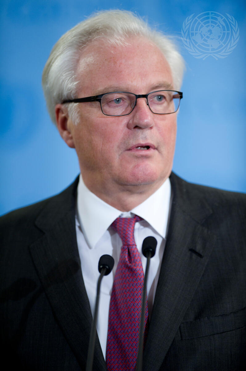 Vitaly I. Churkin, Permanent Representative of the Russian Federation to the UN, speaks to journalists following a closed-door briefing in the Security Council by Kofi Annan, the Joint Special Envoy of the United Nations and the Arab League for the Syrian Crisis.