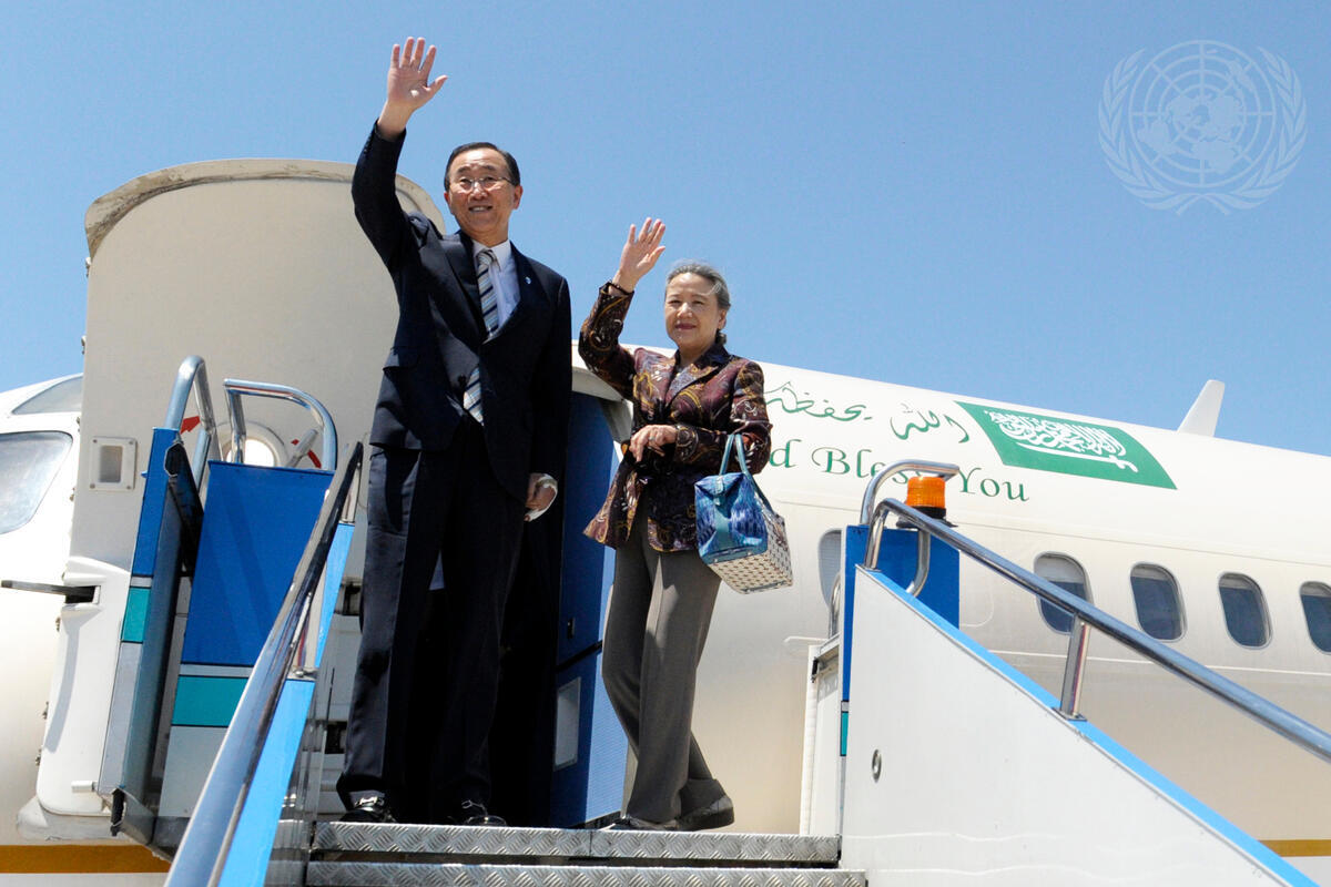 Secretary-General Ban Ki-moon (left) and his wife, Yoo Soon-taek, wave as they leave Istanbul, Turkey, for Saudi Arabia.