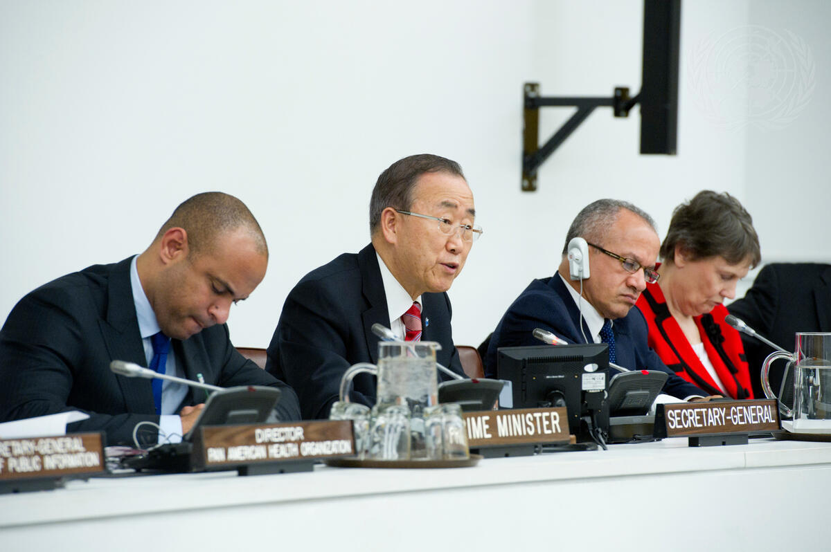 Secretary-General Ban Ki-moon (second from left) addresses the meeting to launch his Initiative for the Elimination of Cholera in Haiti. He is joined by, from left, Laurent Salvador Lamothe, Prime Minister of Haiti; Lorenzo Wilfredo Hidalgo, Minister of Public Health of the Dominican Republic; and Helen Clark, Administrator of the UN Development Programme (UNDP).