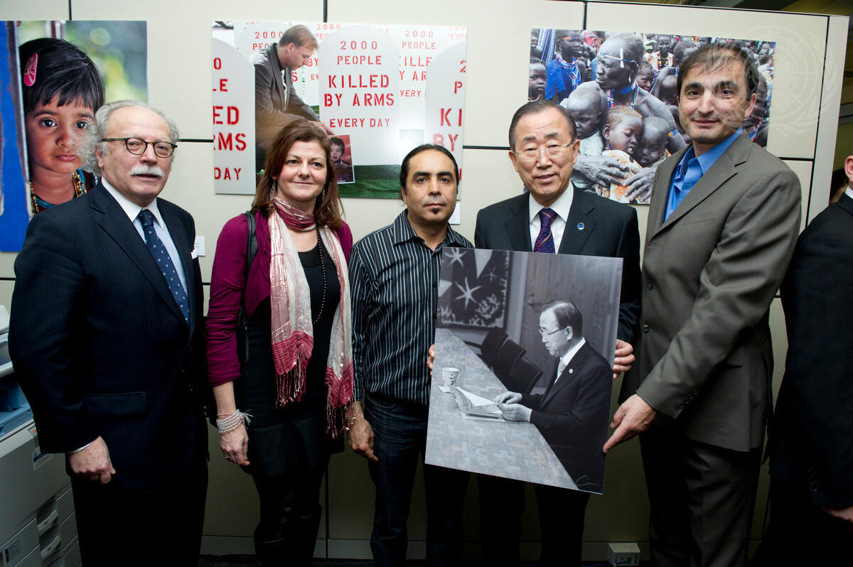 Secretary-General Ban Ki-moon (second from right) holds up a photo of himself included in the UN Correspondents’ Association (UNCA) exhibit, at the opening for the exhibit at UN Headquarters.