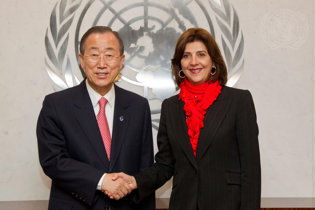 Secretary-General Ban Ki-moon (left) meets with María Ángela Holguín Cuéllar, Minister for Foreign Affairs of Colombia.