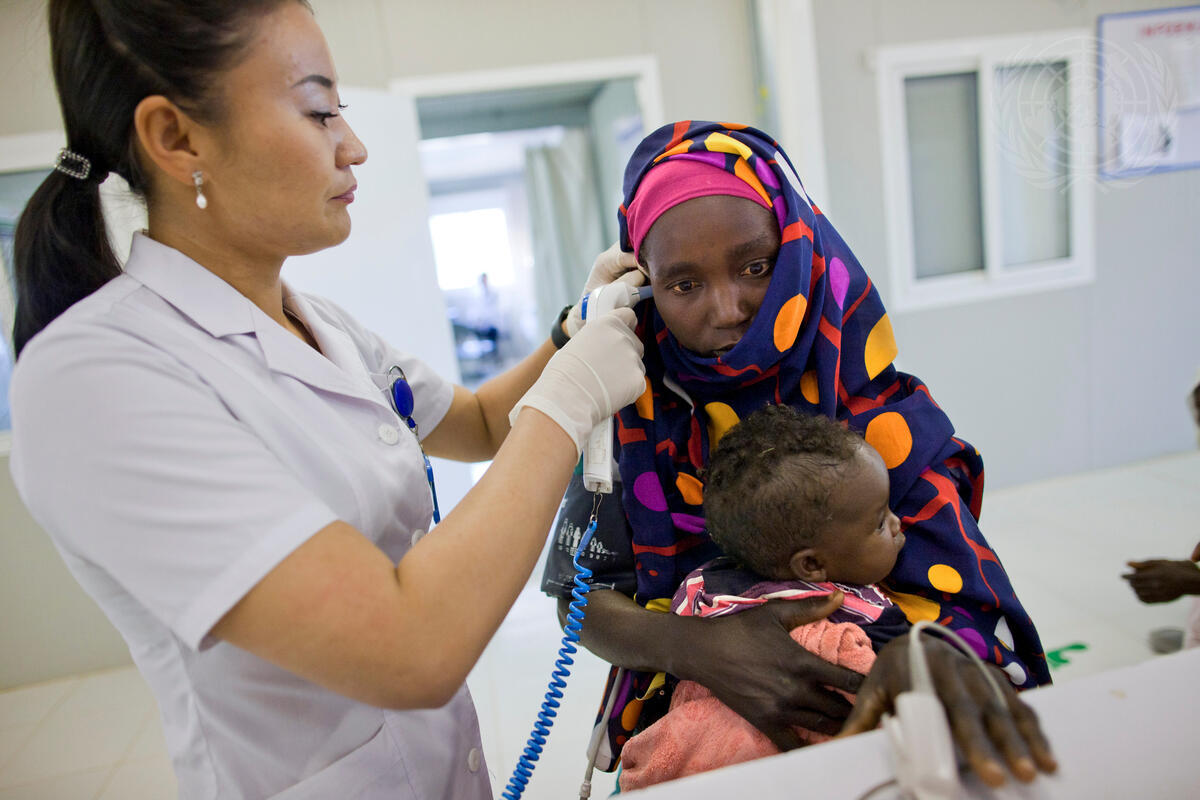 A nurse examines a patient at the hospital run by the African Union-UN Hybrid Operation in Darfur (UNAMID)’s Mongolian contingent in Kabkabiya, North Darfur.