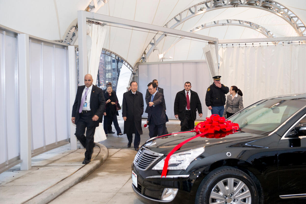 Secretary-General Ban Ki-moon received from the Government of the Republic of Korea a new armoured Hyundai Equus, which will replace his official armoured Mercedes last provided by the Government of Germany. The new vehicle was donated to the Korean Government for the UN by Hyundai Motor.