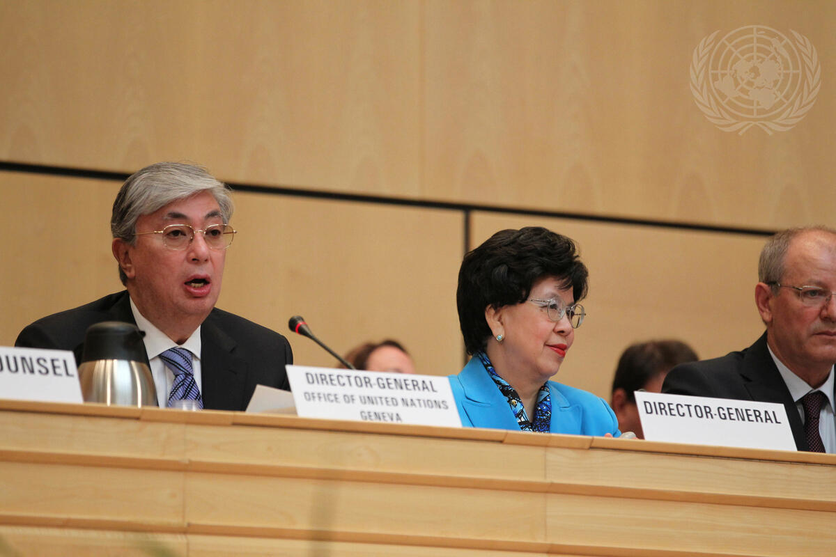 Kassym-Jomart Tokayev (left), Director-General of the UN Office at Geneva (UNOG), speaks at the opening of the sixty-sixth session of the World Health Assembly taking place in Geneva during 20–28 May 2013. On his left is Margaret Chan, Director-General of the World Health Organization (WHO).
