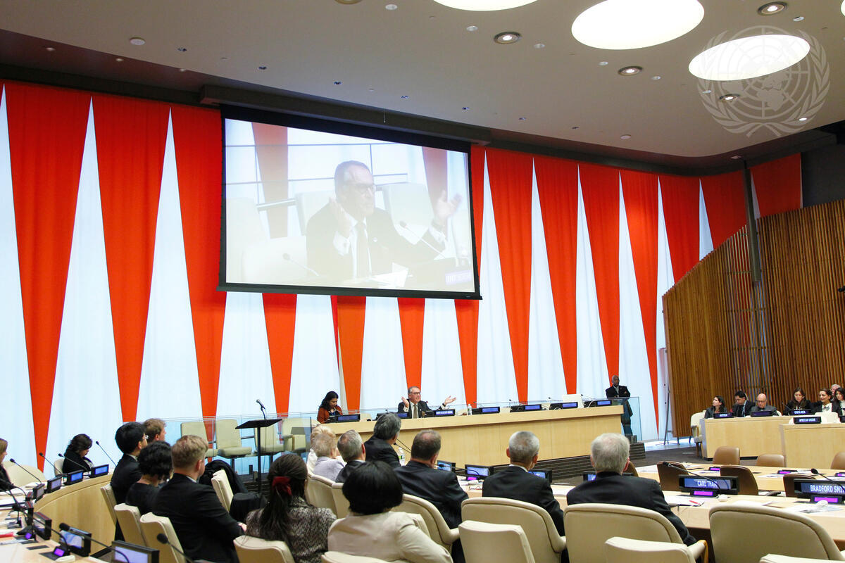 A view of the Economic and Social Council (ECOSOC) Chamber, as Deputy Secretary-General Jan Eliasson (shown at dais and on screen) delivers the closing remarks at the high-level event on human security, hosted by the Secretary-General’s Advisory Board on the subject.
