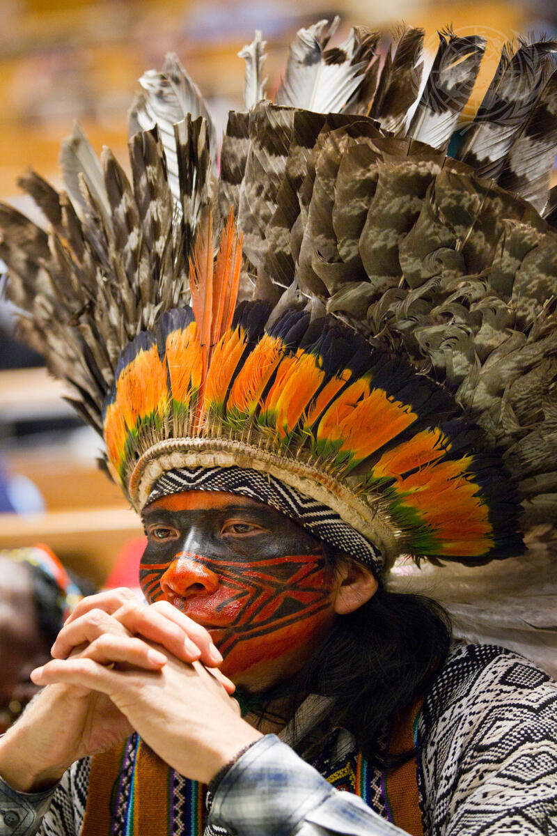An indigenous delegate in the General Assembly Hall at the opening of the twelfth session of the UN Permanent Forum on Indigenous Issues.