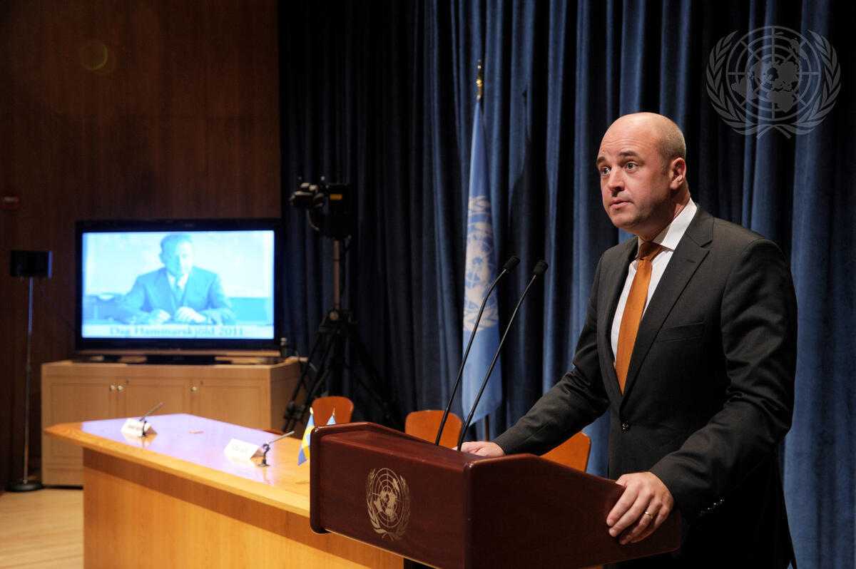 Caption Description Fredrik Reinfeldt (right), Prime Minister of Sweden, speaks at a commemorative event focusing on the late Secretary-General Dag Hammarskjöld's legacy for UN preventive diplomacy in the 21st century. Mr. Hammarskjöld, a Swede, died in 1961 while en route to negotiate peace in what is now the Democratic Republic of the Congo (DRC).
