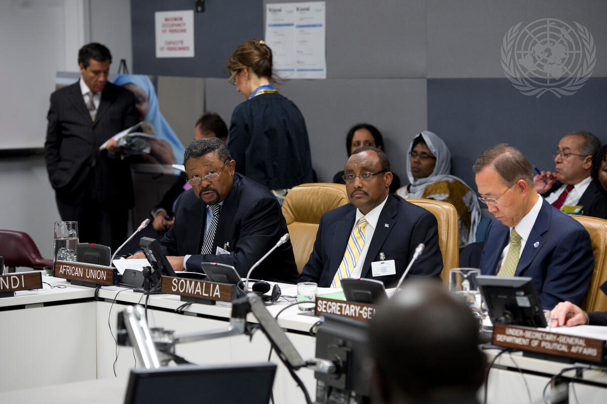 Jean Ping (left), Chairperson of African Union, addresses the Mini-Summit on Somalia. With him are Abdiweli Mohamed Ali (centre), Prime Minister of Somalia, and Secretary-General Ban Ki-moon.