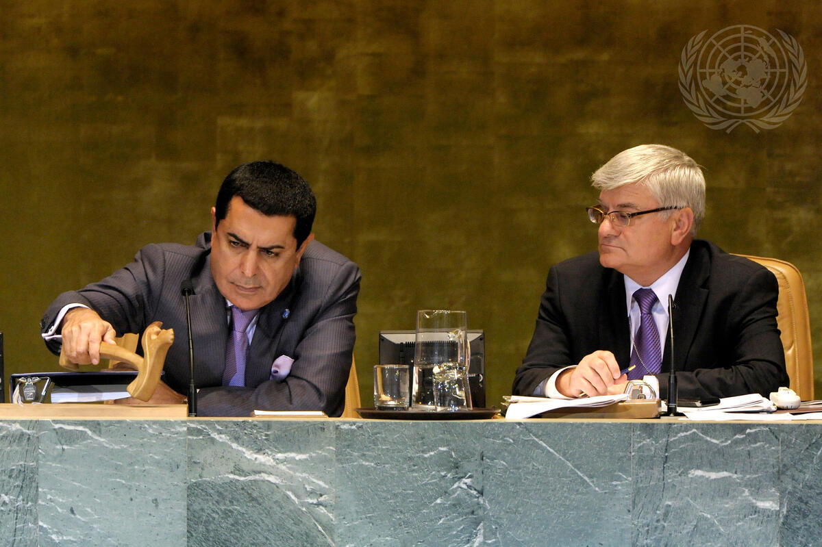 Nassir Abdulaziz Al-Nasser (left), President of the sixty-sixth session of the General Assembly, adjourns the first segment of the Assembly's general debate on the second day of the debate. At right: Ion Botnaru, Director for the General Assembly and the Economic and Social Council (ECOSOC) Affairs Division.