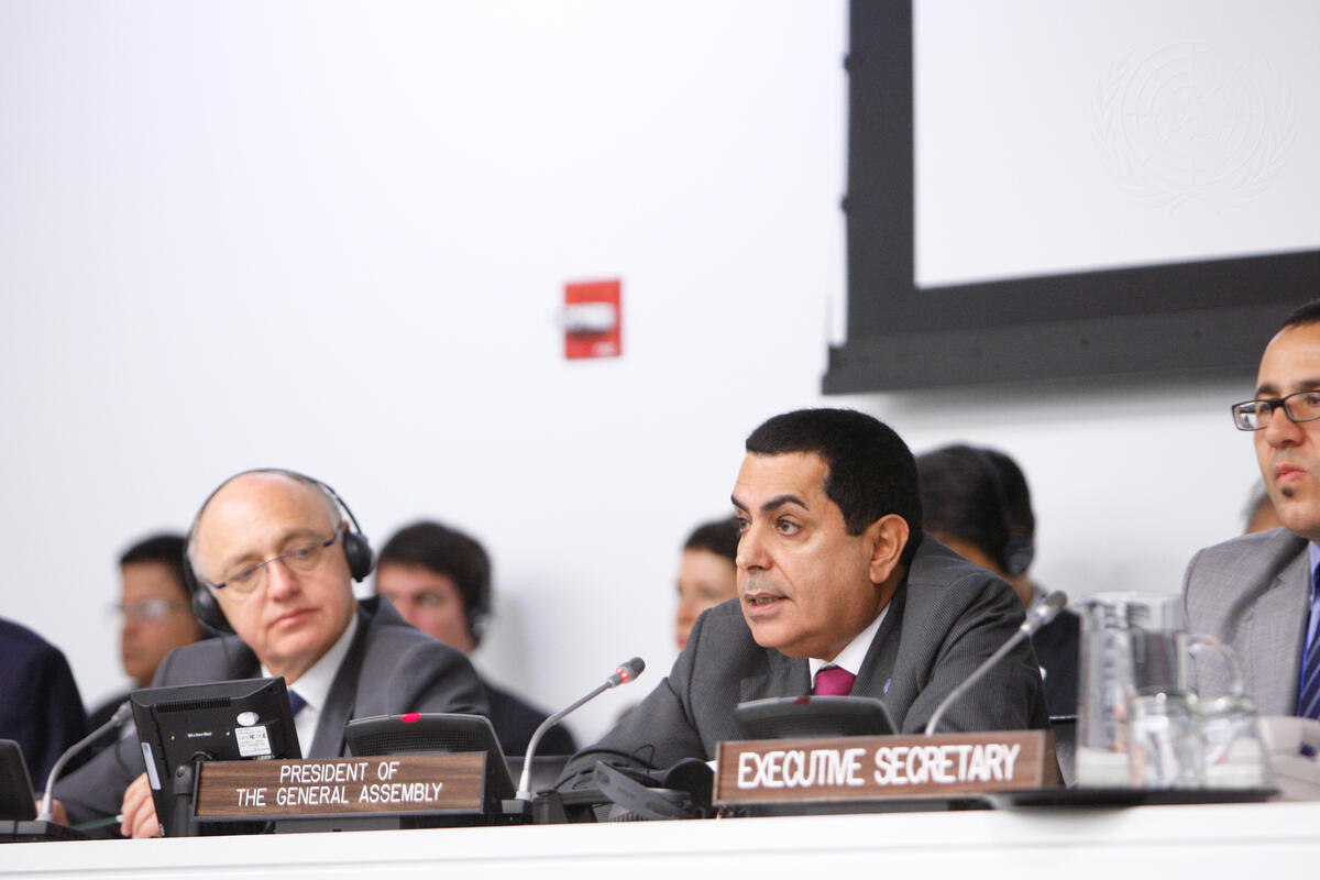Nassir Abdulaziz Al-Nasser, President of the sixty-sixth session of the General Assembly, addresses the Group of 77 developing countries and China (G77). At left is Héctor Marcos Timerman, Minister for Foreign Affairs of Argentina, and Chair of the G77.