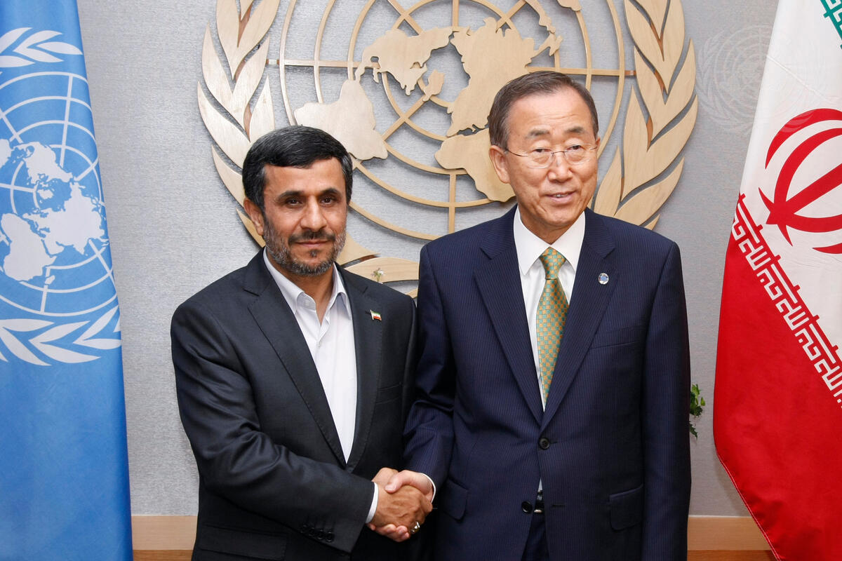 Secretary-General Ban Ki-moon (right) meets with Mahmoud Ahmadinejad, President of the Islamic Republic of Iran.
