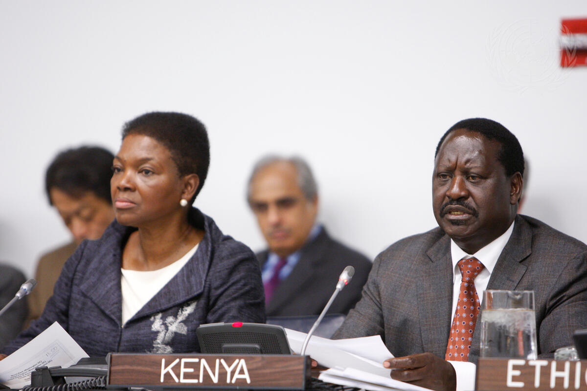 Raila Odinga (right), Prime Minister of Kenya, addresses the ministerial-level Mini-Summit on the Humanitarian Response in the Horn of Africa. Next to him is Valerie Amos, UN Under-Secretary-General for Humanitarian Affairs and Emergency Relief Coordinator.