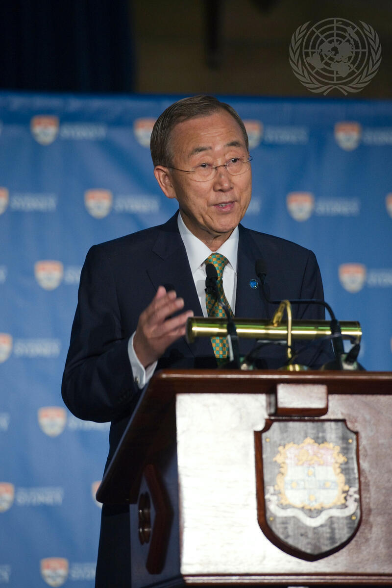 Secretary-General Ban Ki-moon (at podium) delivers a lecture at University of Sydney entitled “Australia and the 21st Century United Nations: Priorities for a Changing World”. He told the audience that the world needs to redouble efforts to fight climate change: "The facts are clear. Global greenhouse gas emissions continue to rise. Millions of people are suffering today from climate impacts. Climate change is very real."