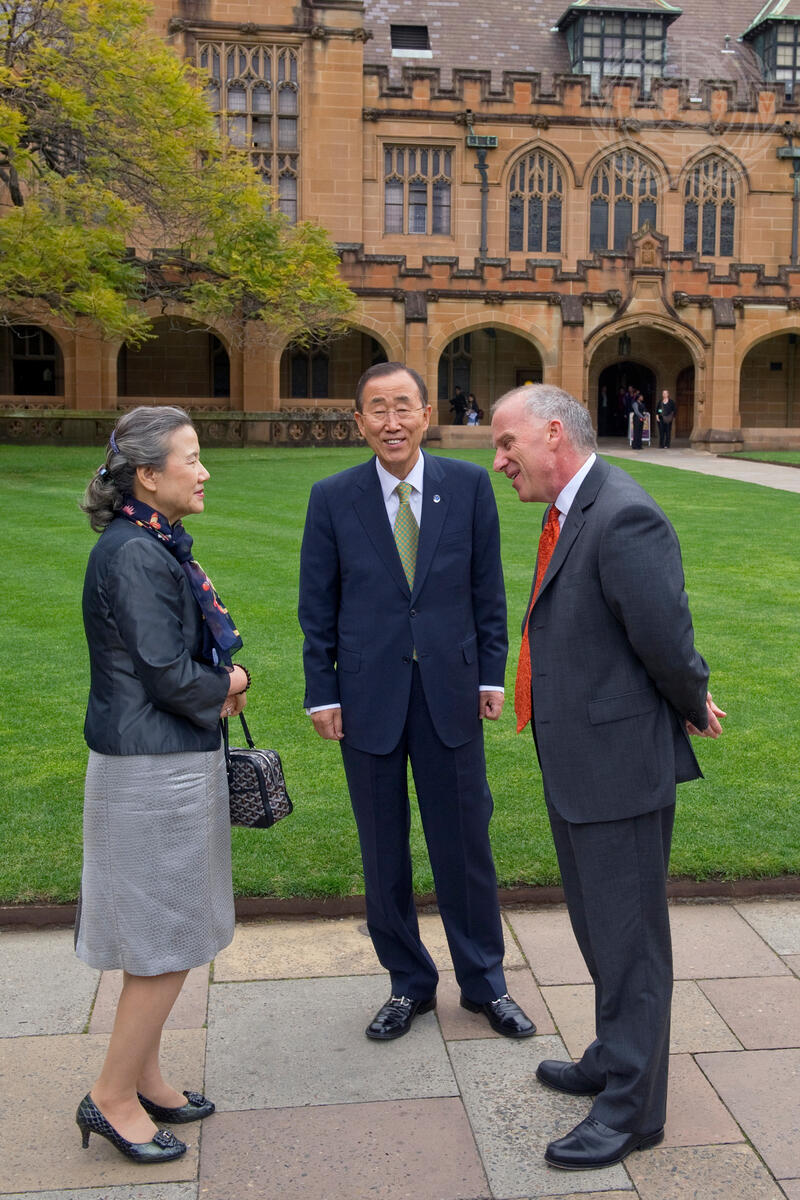 Secretary-General Ban Ki-moon (centre) and his wife, Yoo Soon-taek (left), meet with Michael Spence, Vice-Chancellor of the University of Sydney in Australia.
