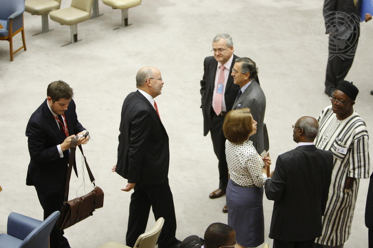 Guillermo E. Rishchynski (second from left), Permanent Representative of Canada to the UN and Chair of the Sierra Leone configuration of the Peacebuilding Commission, converses with Néstor Osorio (fourth from right), Permanent Representative of Colombia to the UN, before a meeting of the Security Council on the situation in Sierra Leone.
