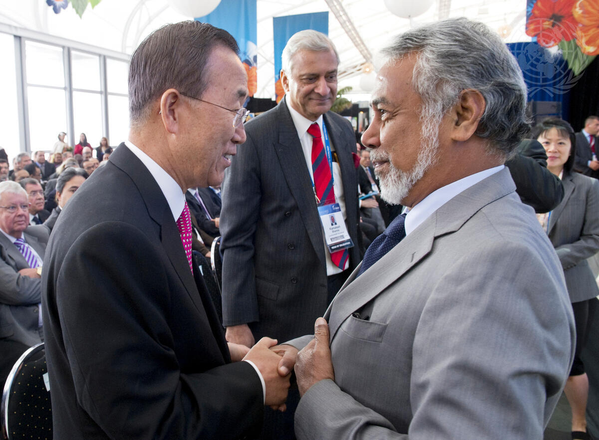 Secretary-General Ban Ki-moon (front, left) meets with Kay Rala Xanana Gusmão, Prime Minister of the Democratic Republic of Timor-Leste, at the opening ceremony of the 42nd Pacific Islands Forum in Auckland, New Zealand.