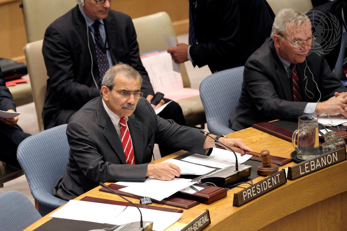 Nawaf Salam (right), Permanent Representative of Lebanon to the UN and President of the Security Council for September, opens the Security Council meeting on the situation in Somalia.