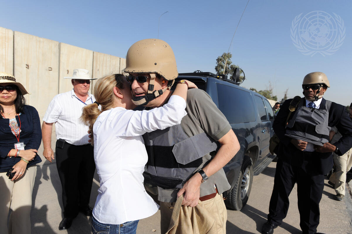 Ad Melkert (centre right), outgoing Special Representative of the Secretary-General for Iraq and outgoing Head of the UN Assistance Mission in Iraq (UNAMI), is embraced by a Mission staff member as he says his final goodbyes before leaving the UNAMI base in Baghdad.