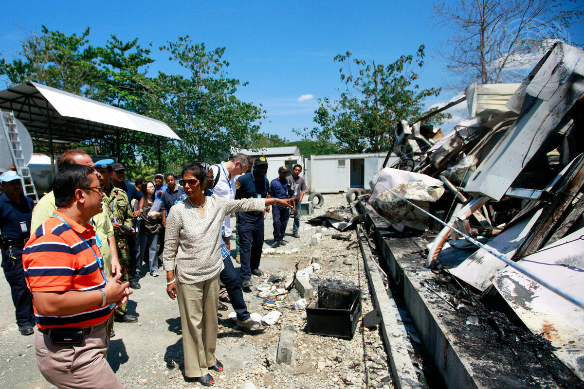 Ameerah Haq (front, right), Head of the UN Integrated Mission in Timor-Leste (UNMIT), inspects the mangled remains of UNMIT’s compound in Suai the day after a fire erupted there.