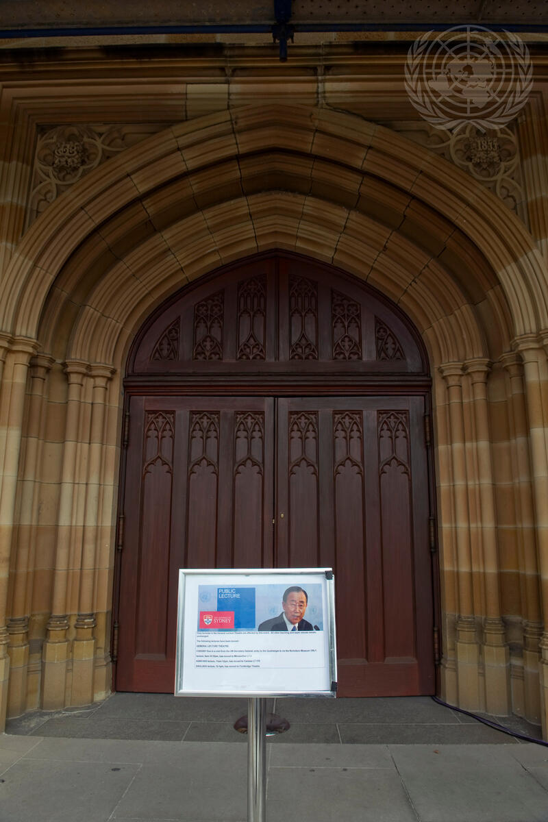 A sign at the University of Sydney, Australia, promotes Secretary-General Ban Ki-moon’s appearance at the University, where he delivered a lecture to students today.
