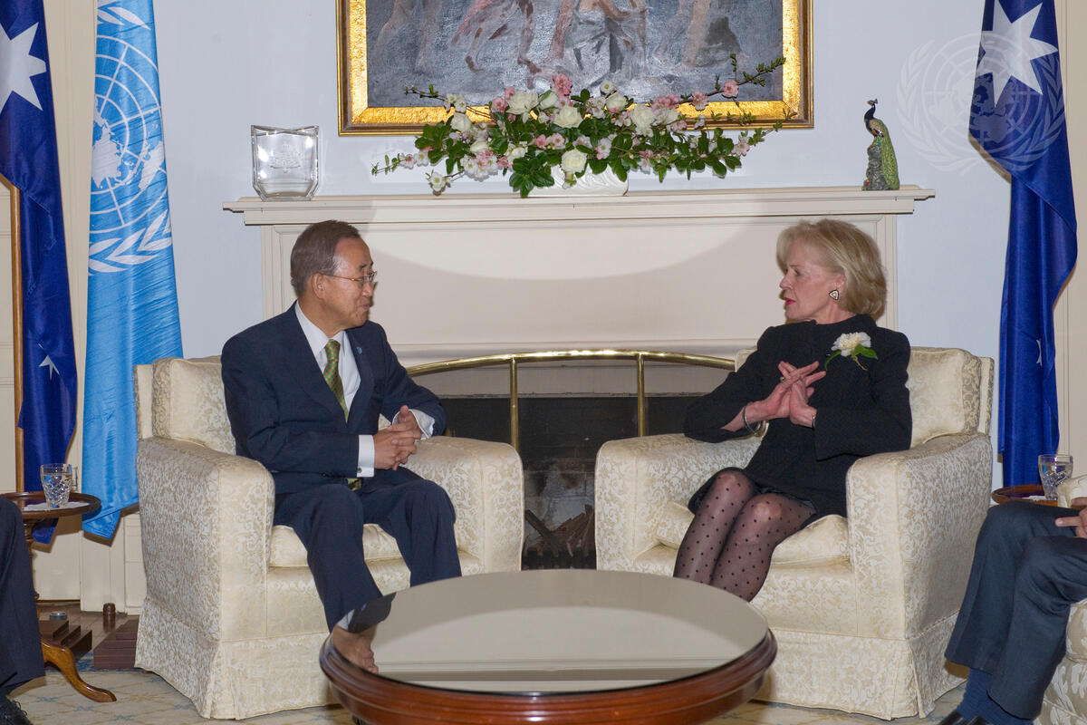 Secretary-General Ban Ki-moon (left) meets with Quentin Bryce, Governor-General of Australia, in Canberra.