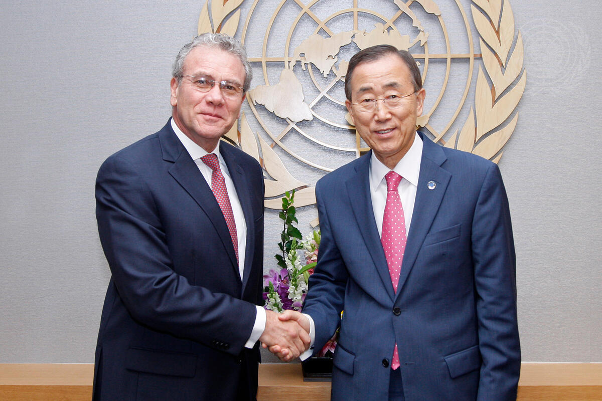 Gonzalo Gutiérrez, outgoing Permanent Representative of Peru to the UN, pays a farewell call on Secretary-General Ban Ki-moon.